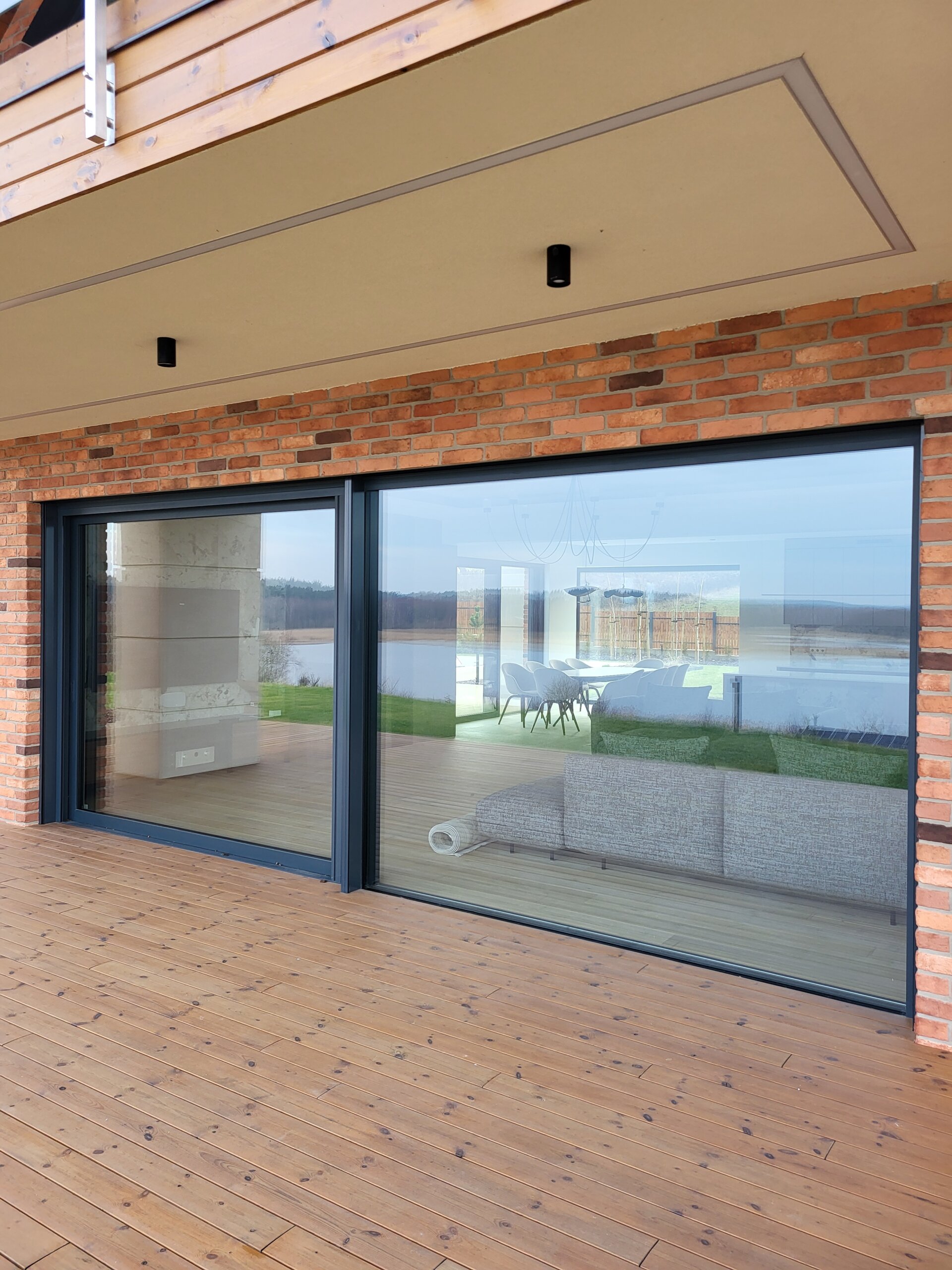 Szklana ściana z ogromną 8-metrową konstrukcją przesuwną oraz szkłem z powłoką selektywną.