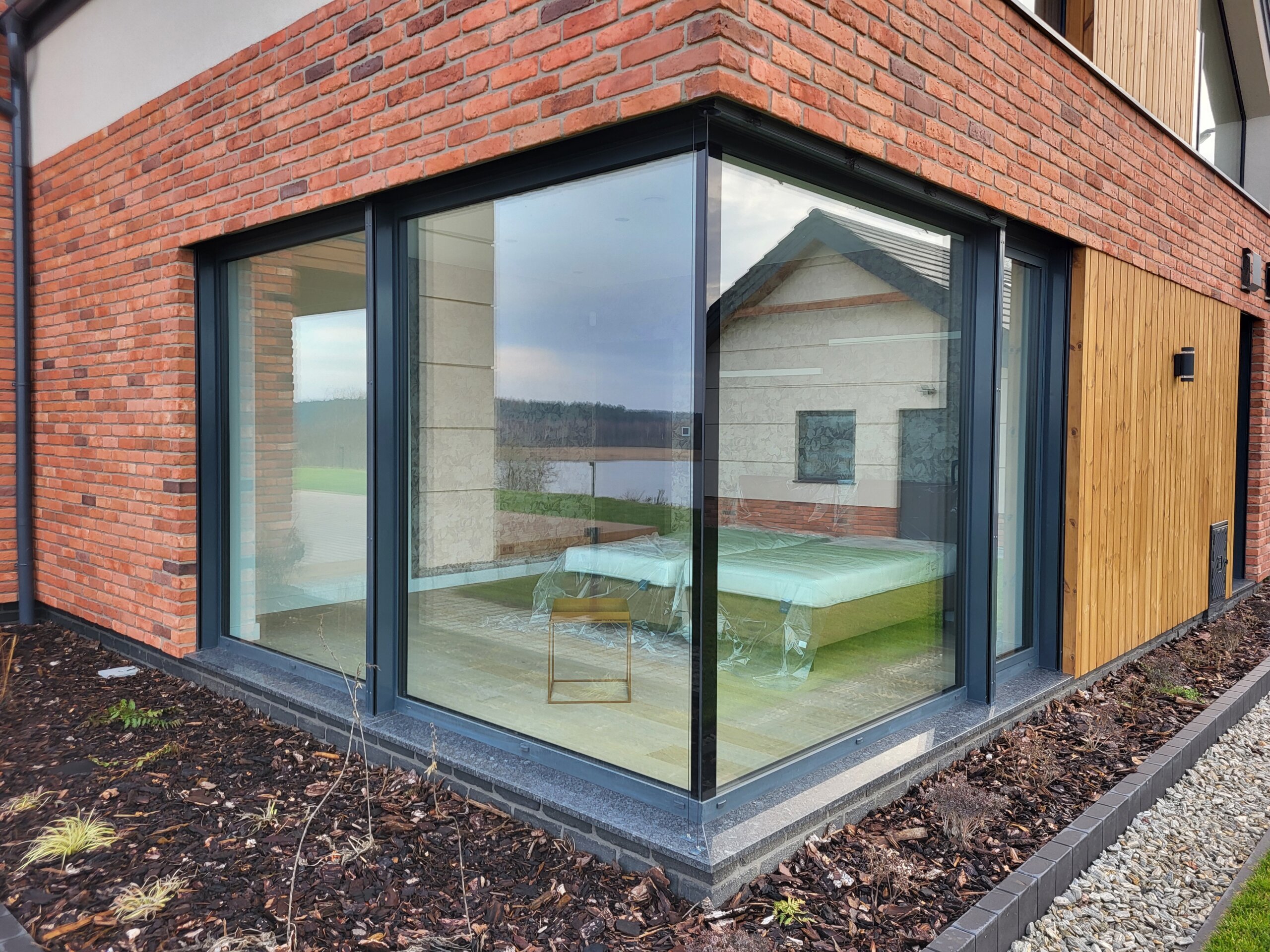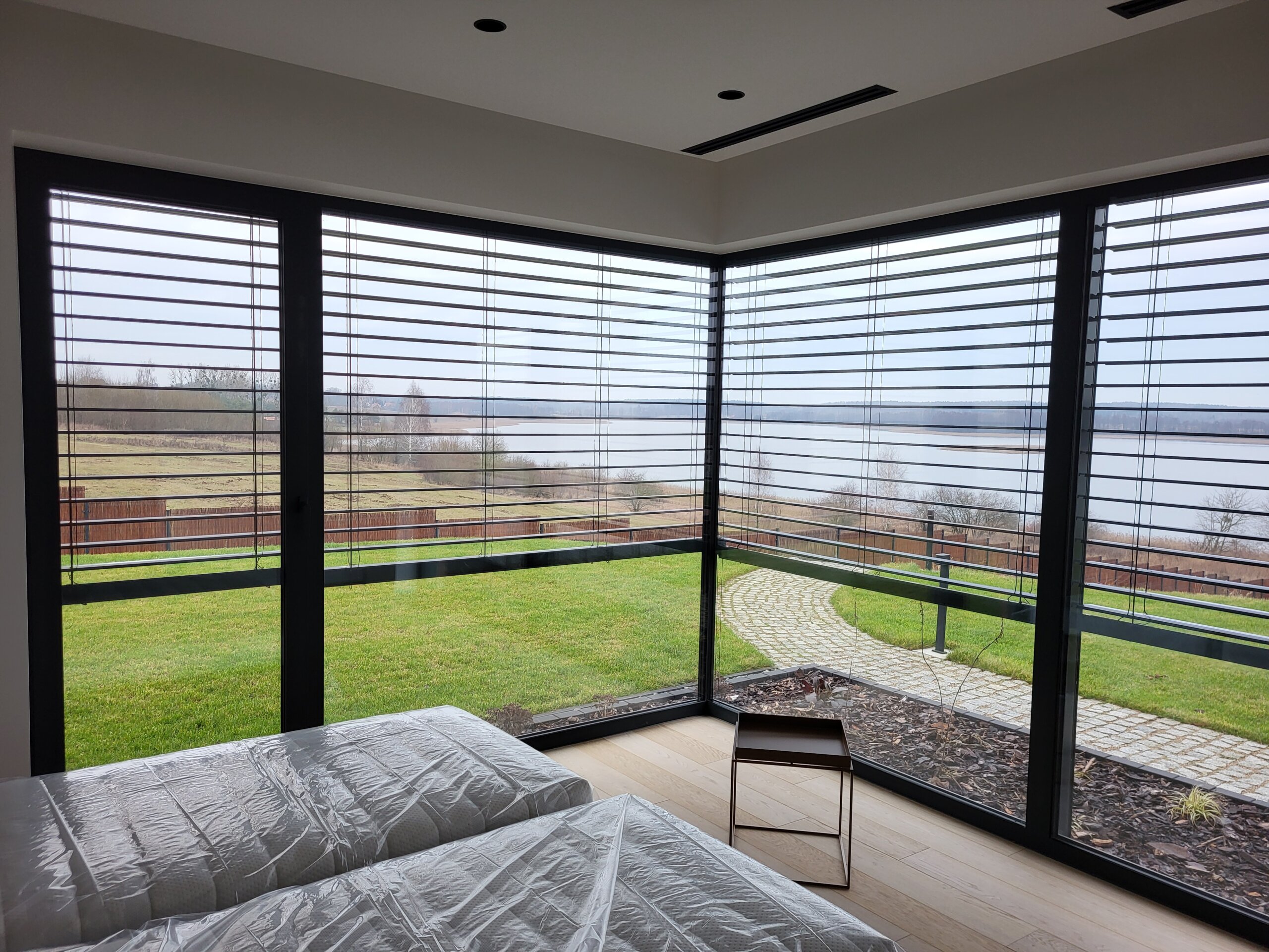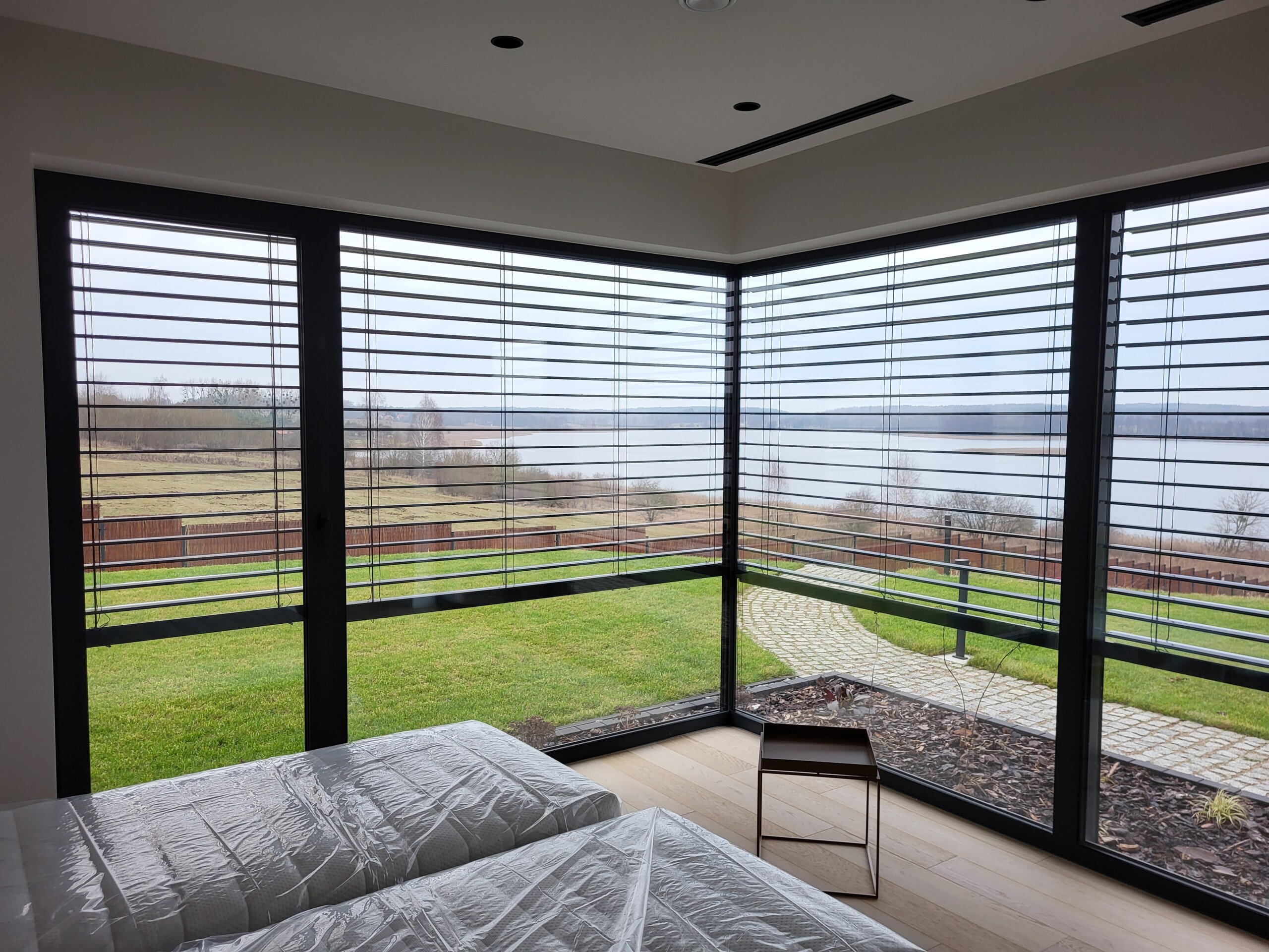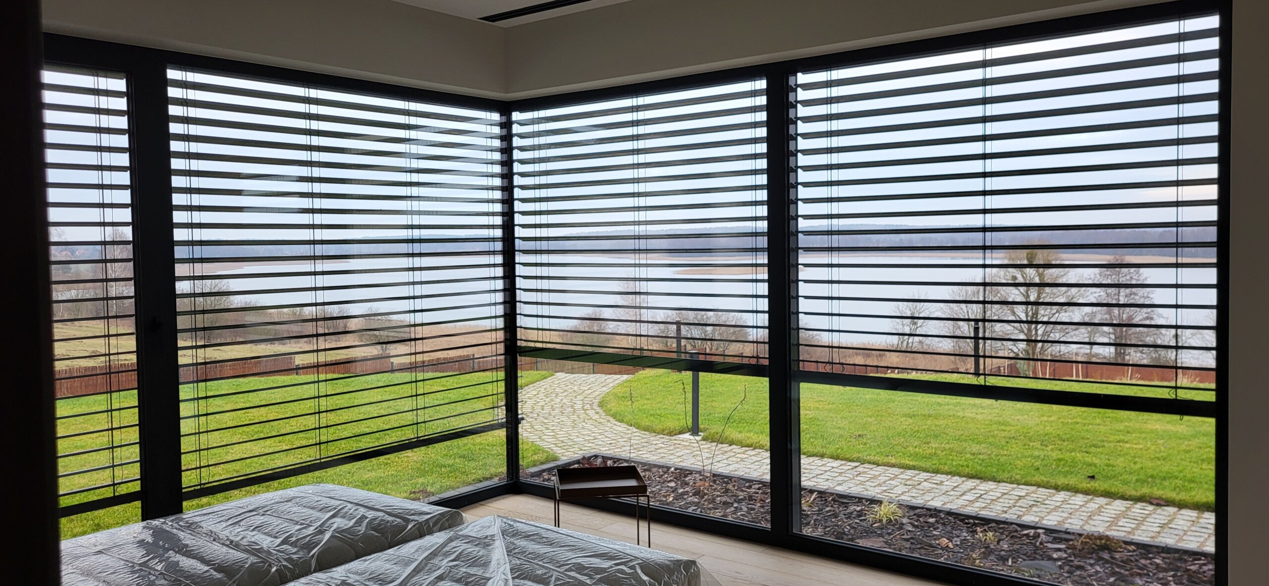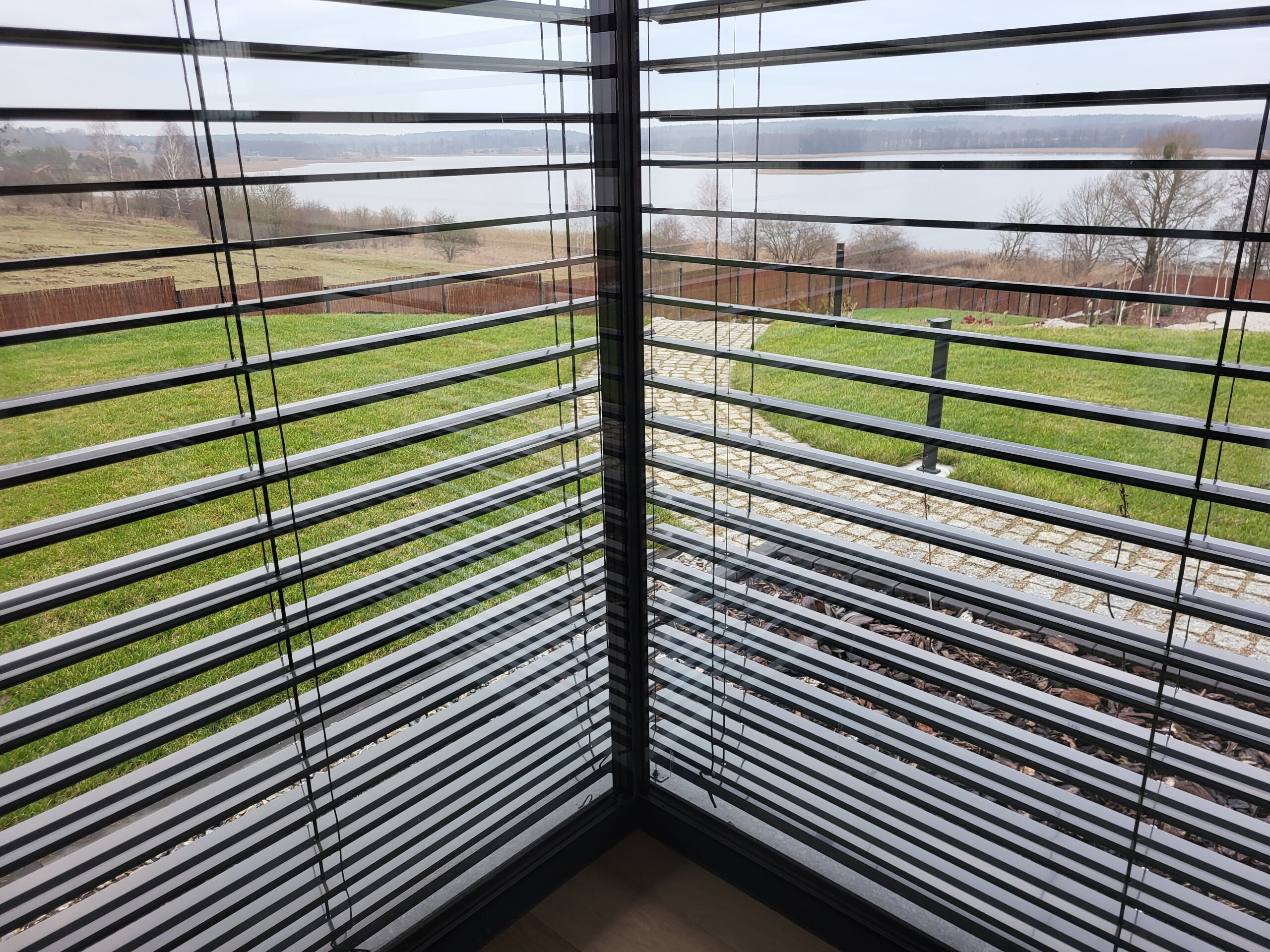 Nowoczesna architektura wymaga rozwiązań równie innowacyjnych. Żaluzje narożne, zaprojektowane dla przeszkleń 90°, umożliwiają swobodne otwarcie i pełne przesunięcie lamel, bez prowadnic w narożnikach.